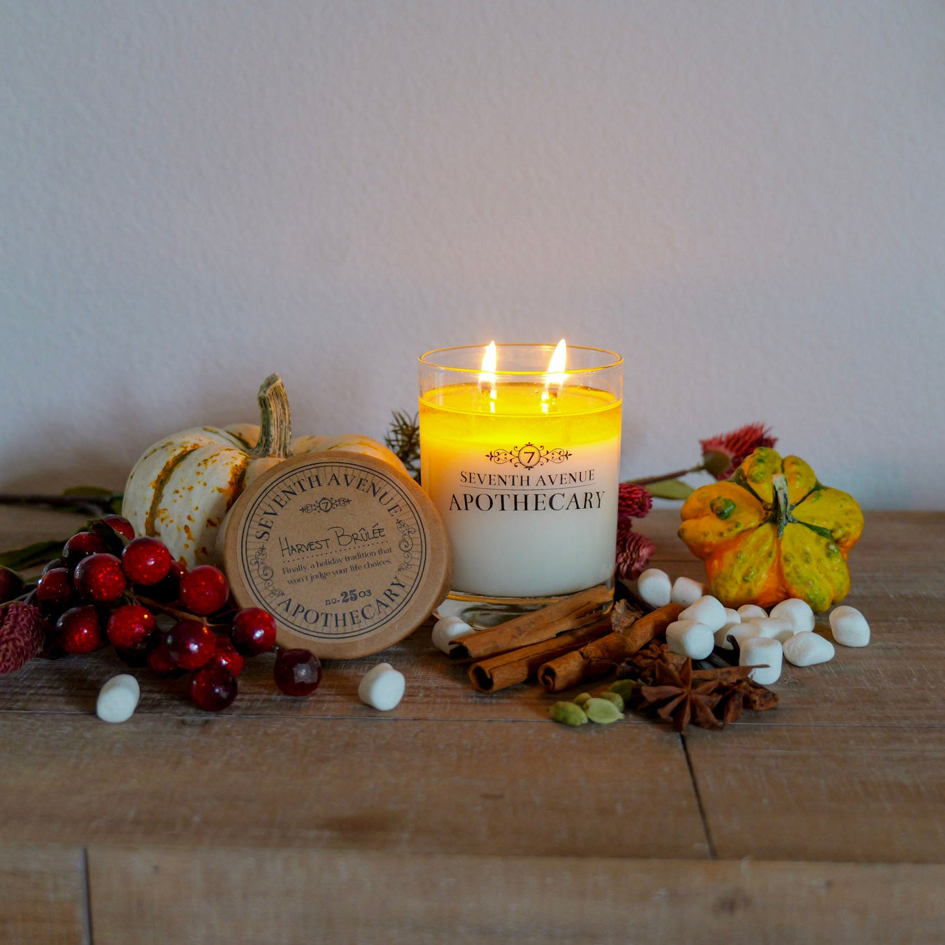 Harvest Brûlée is autumn indulgence in a jar. It opens with the warm spice of cinnamon and clove, wrapped around creamy pumpkin and the bright tartness of cranberry. A swirl of toasted marshmallow softens the edges, adding a playful sweetness that feels both nostalgic and decadent. Together, these notes create the essence of a festive table: comforting, celebratory, and just a little irresistible. Light it, and you’re instantly surrounded by the cozy glow of crackling fires, shared laughter, and the sweetest traditions of the season.